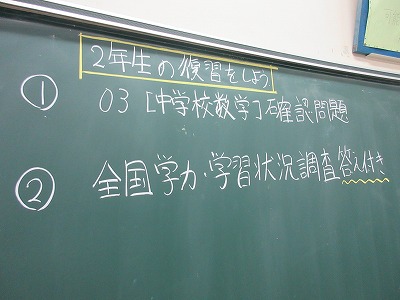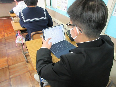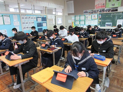 2年生の数学の授業です。学年のまとめの学びをしてます。今日は,タブレットを活用して問題を解いています。直接タブレットに書き込むことが出来る「metamoji」を使っています。みんな一生懸命に取り組んでいます。