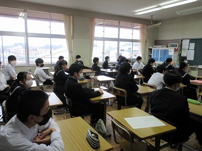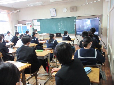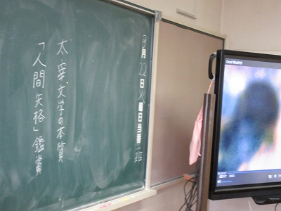 2年生の国語の授業です。今日は「太宰文学の本質を学ぶ」ことを学習のテーマとして,「人間失格」の動画を鑑賞しています。みんな作品に引き込まれています。