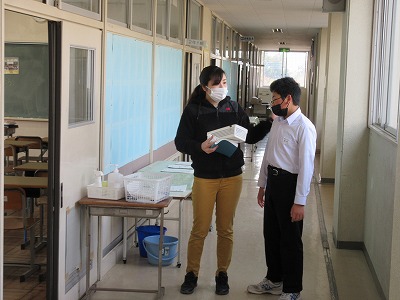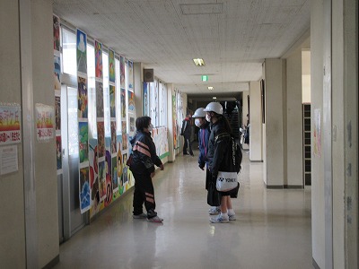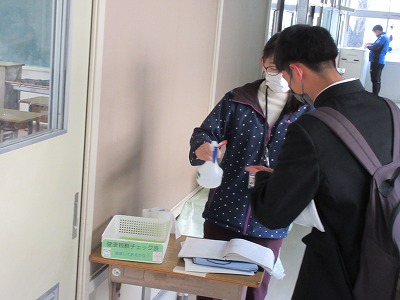 2年生,廊下での朝の健康観察の様子です。みんな元気に登校しています。