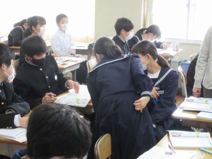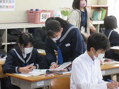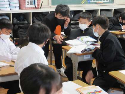 1年生の数学の学習では、正反対の数(プラスとマイナス)について学習していました。自分の力で解決したものを近くの友達と共有する時間には、積極的に考えを伝え合う姿が見られました。