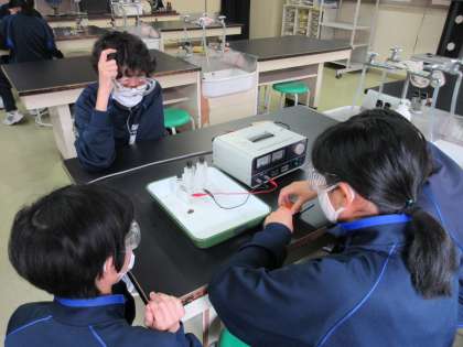 2年生の理科の授業では、「電気による水の分解」について実験をすすめていました。