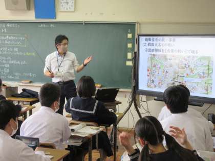 戦国時代の全国統一を目指す戦いについて、電子黒板の映像を活用しながら、当時のことについて考えを深める学習に取り組んでいました。