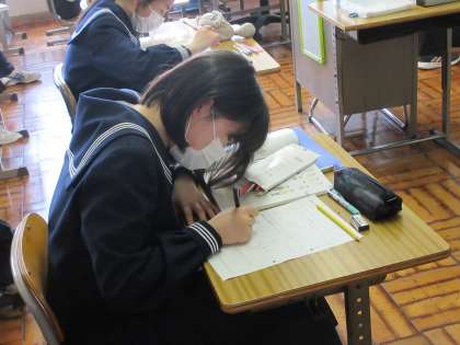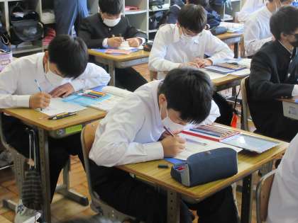 4月22日(金)授業風景 その4 公開日 2022/04/22 更新日 2022/04/22 お知らせ 2年生 家庭科の授業です。 衣服の働きについての学習です。 自分らしい衣服のデザインを各自が考える時間でしたが、集中して、一人一人が考える姿が見られました。