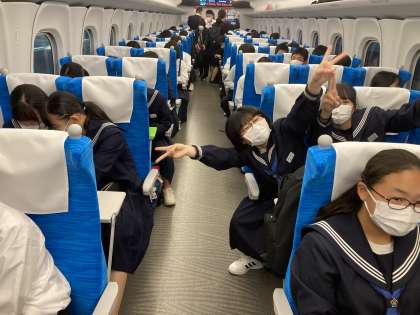 8時30分現在。新幹線の車内です。現在、新富士駅付近です。車内では、楽しくゲームをしたり、話をしたりして、生徒たちは過ごしています。