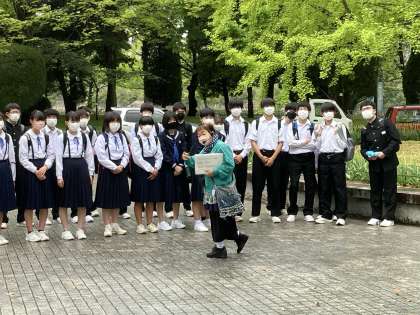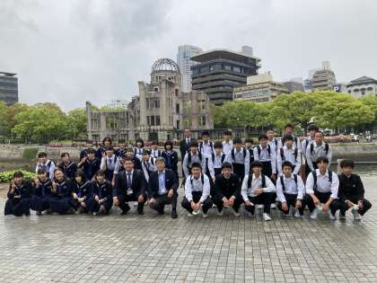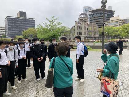 原爆ドーム前で、ボランティアの方から、原爆が投下された当時の話を聞かせていただいています。真剣な表情で話を聞く生徒たち。現地での学習で、自分の考えを深めていくことでしょう。