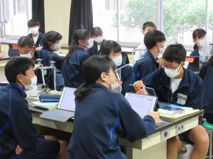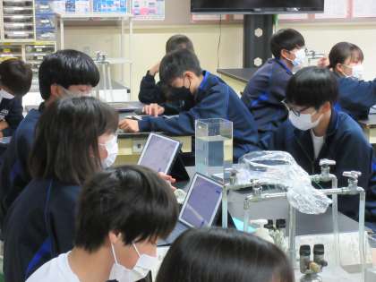実験が終わった後の教室訪問になりましたが、タブレットを活用して手元で実験結果を考察したり、自分の考えを自信をもって発表したりするようすが見られました。
