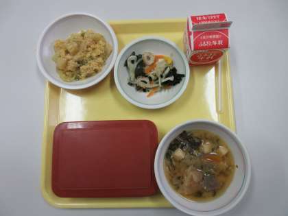 今日の給食は、ごはん・牛乳・野菜の卵とじ・わかめサラダ・みそけんちん汁です。