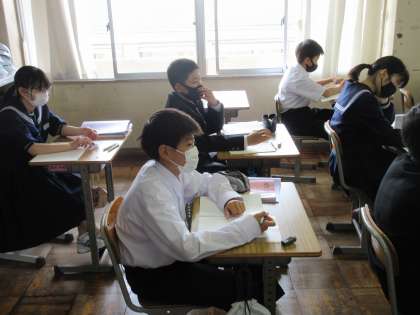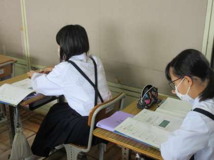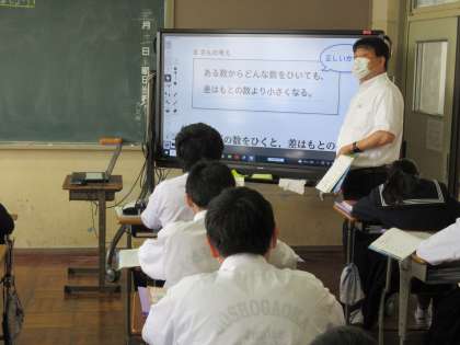 加法と減法の混じった計算の導入で、「ある数からどんな数をひいても差はもとの数より小さくなる。」という考えが正しいかどうか、考えていました。これまでの学習から、幅が広がる内容で、生徒たちは悩みながらも、一生懸命、考える姿が見られました。