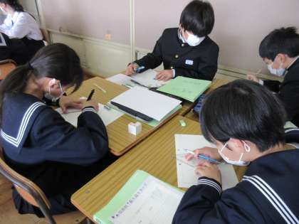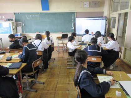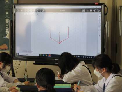 階段状の立体をどう立体としての図面に表すか、電子黒板に映し出されるヒントをもとに、一人一人がチャレンジするようすが見られました。
