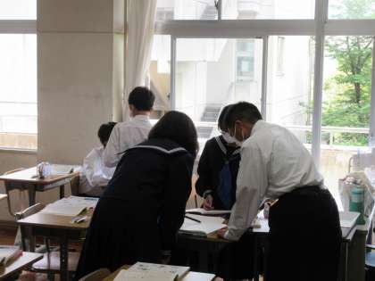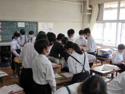 写真は、横の列の生徒で集まり、話合いをするようすです。