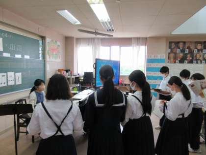 5月12日(木) 授業風景 その10 公開日 2022/05/12 更新日 2022/05/12 お知らせ 2年生の音楽の授業です。 パートごとに分かれ、合唱の練習をしています。 曲は「夢の世界に」です。パートごとに集まり、協力して練習に取り組む生徒たち。 どんなハーモニーが響き合わせることができるか、全体での合唱が楽しみです。
