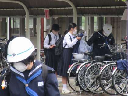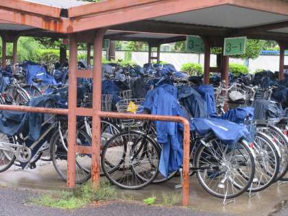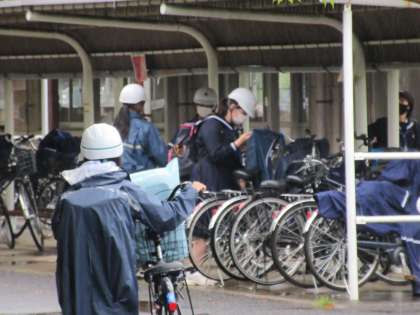 自転車に乗り、雨合羽で登校した生徒は、自転車置き場で一仕事をします。