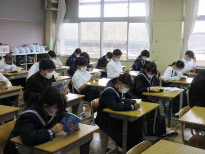 続けて、1年生の教室に訪問すると、朝の会が終わり「朝読書」に取り組む生徒たちの姿が見られました。
