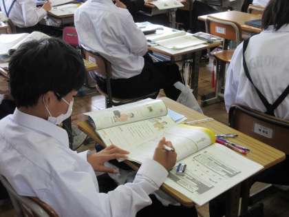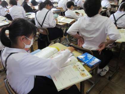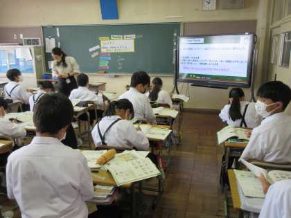 学校の施設について、「〜はどこですか?」という文を正しく書く学習に取り組んでいました。Where や When から始まる英文づくりに、進んで取り組むようすが見られました。