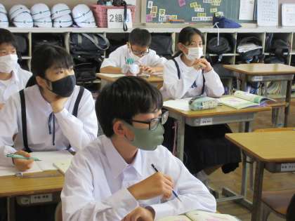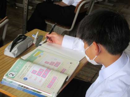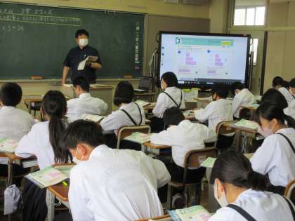 決まった数ずつふえる数を□を使った式で表します。生徒たちは、集中して問題を解いていました。