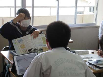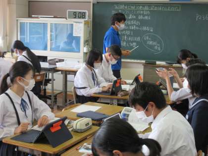 6月15日(水) 授業風景 その9 公開日 2022/06/15 更新日 2022/06/15 お知らせ 3年生の社会科の授業です。 太平洋戦争後、日本がどのように他の国から認められていったのかを考える学習です。 タヴレットを活用し、付箋の機能を使って、国内・経済・外交のテーマのもと、意見交換をしていました。