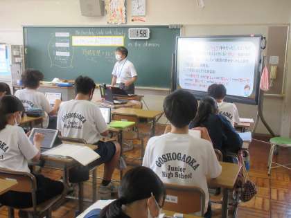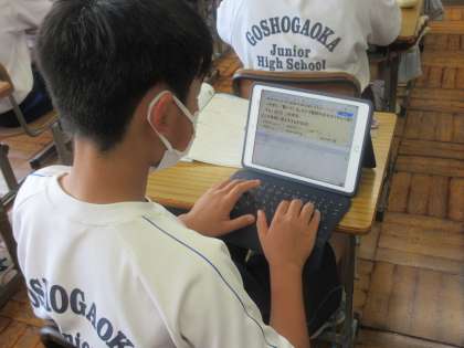 7月6日(水)授業風景 その1 公開日 2022/07/06 更新日 2022/07/06 お知らせ 2年生の英語科の授業です。 今日は、1・3年生が実力テストですが、2年生は通常通りの授業を実施しています。 英語科の授業では、MetaMojiを活用した学習に取り組んでいました。 「to+動詞」についてのまとめをタブレットに書き込んでいます。タッチペンを使ったり、キーボードを使ったり、タブレットの活用が進んでいます。