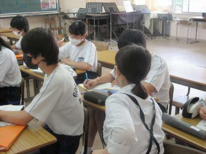 「夏の思い出」の合唱を目標に学習に取り組んでいました。情景を思い浮かべながら、歌詞を大切にして歌うめあてに向かって、友達と考えを共有しな楽譜の読み取りを行っています。