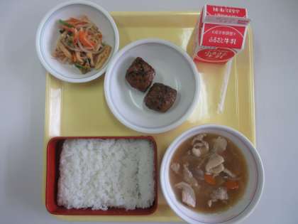 今日の給食のメニューは、ごはん・牛乳・たれつき鶏つくね・油揚げ・豚汁です。