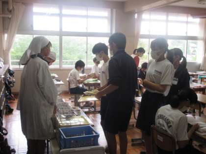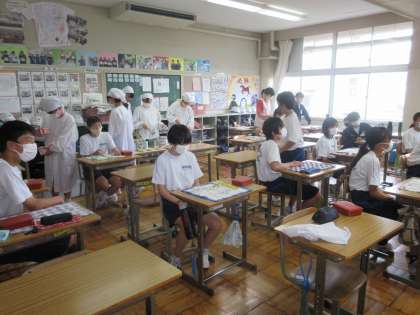 2年生の教室の給食準備風景です。スムーズな準備、頑張っています。