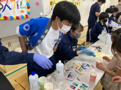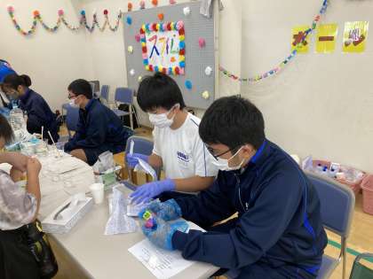 本校、科学研究部の生徒が、北守谷児童館の祭で、活躍しています。科学研究部で実践してきた「スライム」作りです。次から次へと来店する小さな子どもたちのために、頑張っていました。笑顔で活動する生徒たち。素晴らしい経験になっていました。