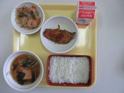 今日の給食のメニューは、ごはん・牛乳・あじと野菜の甘酢ソースがけ・しらたきの炒め煮、生揚げともやしのみそ汁 です。