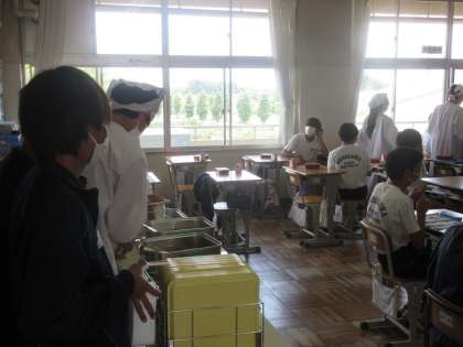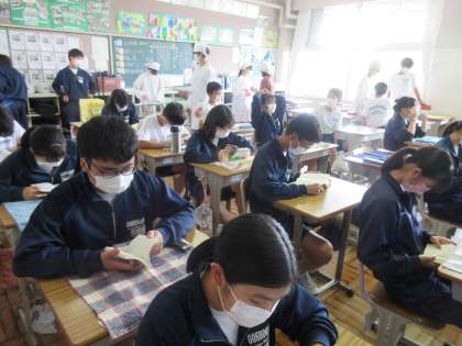 3年生の教室では、給食当番は準備をスムーズに、その他の生徒は静かに待つという体制ができていて、準備が早いです。