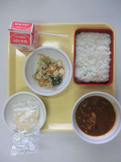 今日の給食のメニューは、玄米ごはん・牛乳・夏野菜カレー・豆腐とツナのサラダ・冷凍パイナップル です。