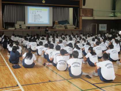 取手地区保護司会の皆様をお招きし、薬物乱用に関する映像、危険度ラック使用後に交通事故を起こした写真などを見て、生徒たちは考えを深めていました。