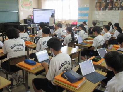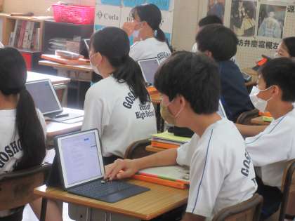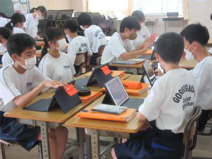 ジョーズのテーマの鑑賞をしていました。自分で鑑賞して気付いたことをまとめた後、グループで意見交換をします。迫力ある曲から、様々な想像をしたようです。
