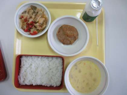 今日の給食のメニューは、ごはん・飲むヨーグルト・ハンバーグおろしソース・パプリカとカリフラワーソテー・コーンポタージュです。
