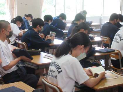 朝の時間に、各教室では4月からのこれまでの学級の頑張りについて、担任の先生からのメッセージをいただいたり、具体的な話を聞いたりしていました。朝の会が終了後は、すぐに朝読書の準備をする生徒たち。
