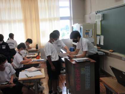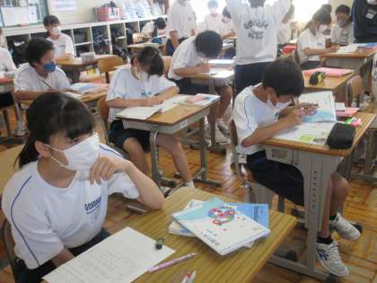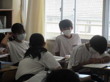 これまでの学習のまとめや確認をしていました。「立場を決めて意見文を書く」活動に取り組む生徒たち。自分考えながら、時々友達と相談しながら、頑張って文を書いていました。