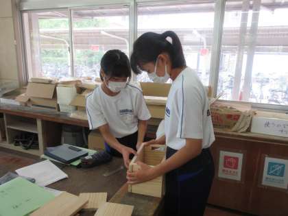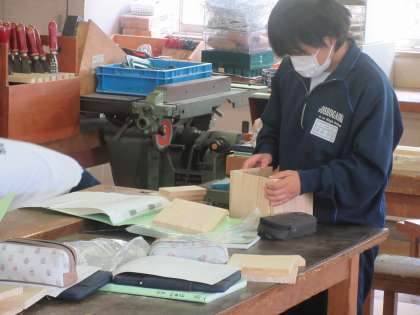 ベルトサンダーなどの工具を使いていねいに部品を作り上げる生徒たち。頑張っていました。(削り終わった生徒は、組み立てに向けた準備をしていました。)