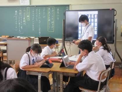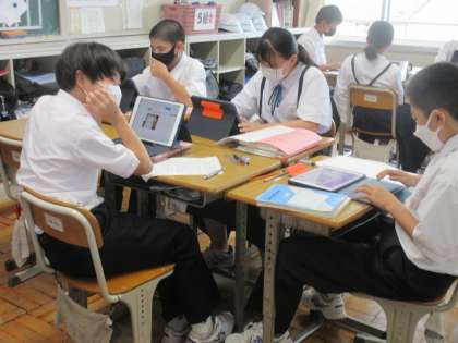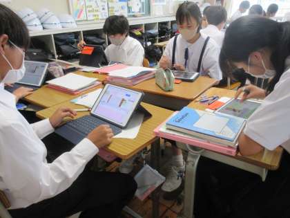 「レポートを読み合い意見を交換しよう」という課題のもと、MetaMojiの付箋機能を使い、意見を書き加えていました。表情よく学習に取り組む生徒たち。互いのよさを認め合いながら、学習が進んでいるようです。