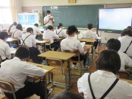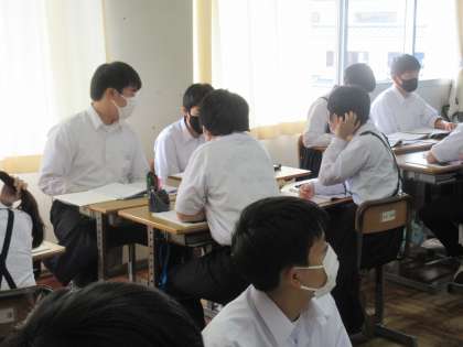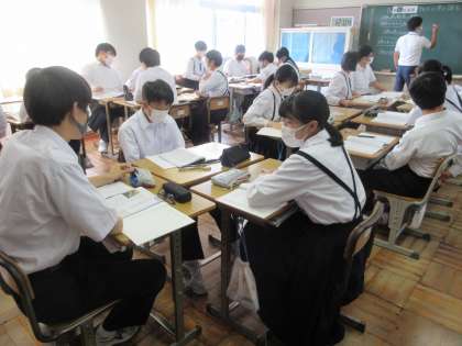 「サルも人も愛する写真家」という教材のもと、生徒たちは熱心に学習に取り組んでいました。畑を荒らすサルへ住民たちは、「サルも憎たらしいけれど、サルを撮っている写真家も憎い。」と言われたときどう考えたか、グループで考えています。様々なことが考えられる内容ですが、生徒たちは自分の考えをグループの中で進んで発言していました。