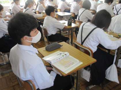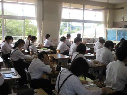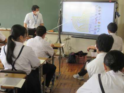 生物の進化について学習しています。樹形図をもとに、生き物の祖先は共通であること・哺乳類の祖先はは虫類であること など、生徒たちは図を見ながら、進化について考えを広げていました。