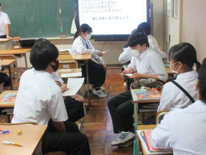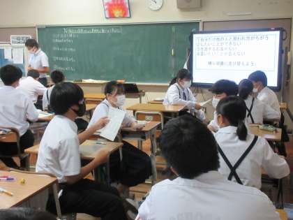 基本的人権についての学習をしています。身近な事例(自分だけ他の人と扱われ方が違う。したいことができない。言いたいことが言えない。・・・)をもとに、自分はどう考えるか、自分の考えをもった上で、グループで話し合っていました。