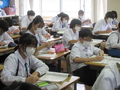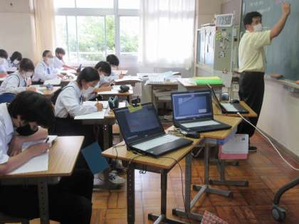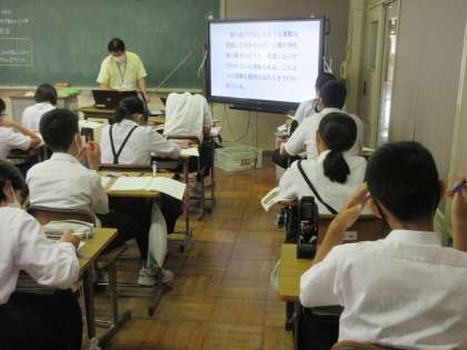 電子黒板に写し出される図をもとに、「骨格」「筋肉のはたらき」などのキーワードを考えを広げています。(オンライン授業も同時に行われています。)