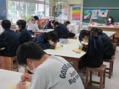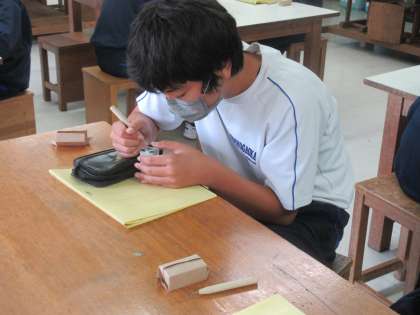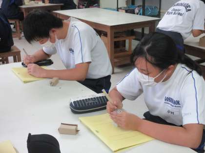 篆刻づくりをすすめています。細かい作業をていねいにすすめる生徒たち。集中して作業に取り組む姿が見られました。