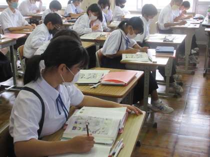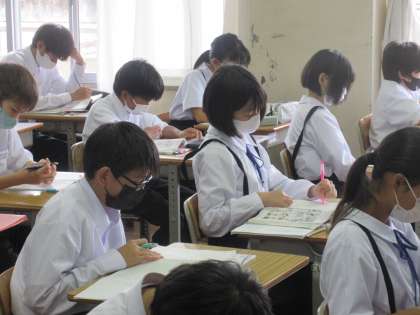 「私のタンポポの研究」の学習に入っていました。今日は、全文を読み大まか内容をつかむ学習です。教材文の範読を聞きながら、教科書の大事な言葉や文に線を進んでひく生徒たち。進んで学習に取り組む姿が印象的でした。