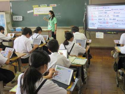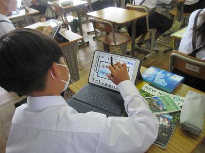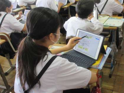 生徒たちは、進んでタブレットを使い、書き込んでいました。タブレットの効果的な活用が進み始めています。