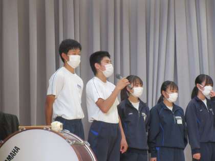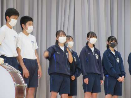 「心を1つに頑張って!」「練習の成果を発揮して!」「絶対勝ってきて!」「気持ちで負けずに。」「躍動してきて!」「3年生のパワーを超えて!」「御所中ファイト!!」など、熱く勇気が出てくるメッセージで、感動の時間でした。