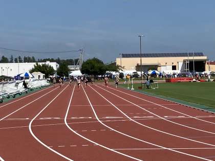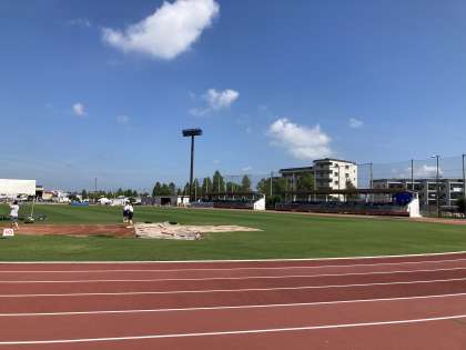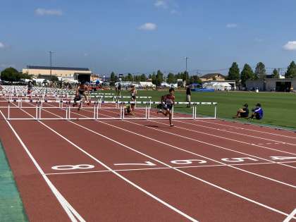 午前中に行われている幅跳び、110mH、200m、800m、1500mの予選に臨んでいます。午後には、男女とも400mリレーにも出場します。応援よろしくお願いします。