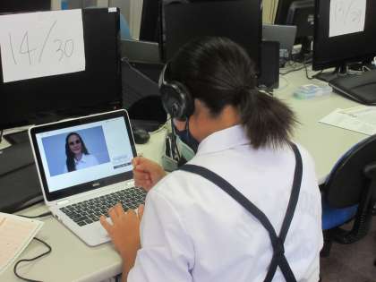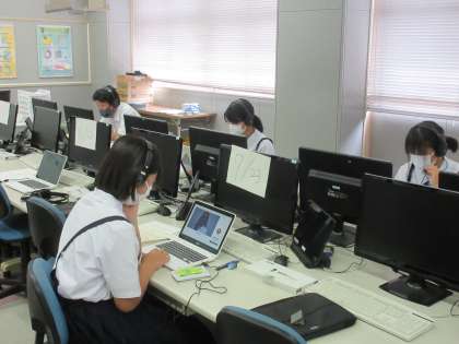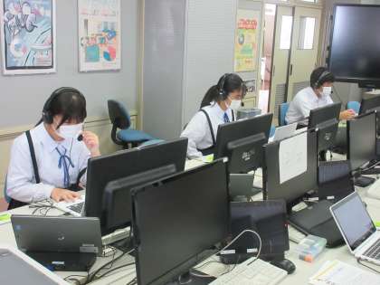 英検IBAに取り組んでいます。各自がタブレットに向き合い、聞く・話す などの技能についてのやりとりをしています。集中して取り組む2年生の生徒たちの姿がコンピュータ室で見られています。