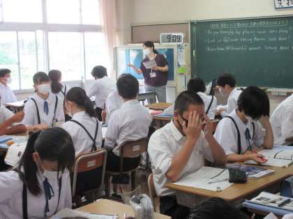 「〇〇先生のとなりにいるきれいな女性を知っていますか?」などの長い日本語の文章を英文にしています。生徒たちから出される考えを活かしながら、正しい英文を追究していました。