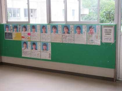 本校の昇降口には、生徒会に立候補した生徒たちのポスターが掲示されています。