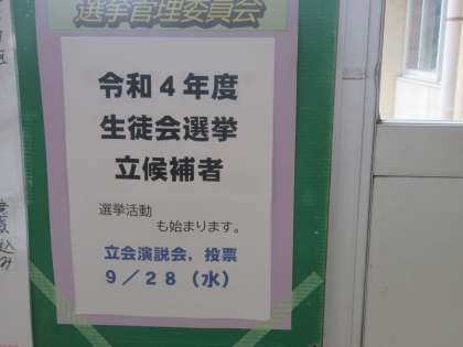 新生徒会役員立候補者立ち会い演説会と選挙は、今月28日。ポスターからは、立候補した生徒の熱い思いややる気が感じられます。