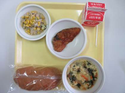 9月21日(水)今日の給食 公開日 2022/09/21 更新日 2022/09/21 お知らせ 今日の給食のメニューは、黒パン・牛乳・いなだのオーロラソース・きのことコーンのソテー・卵とほうれん草のコンソメスープです。 今日もおいしく給食をいただきました。