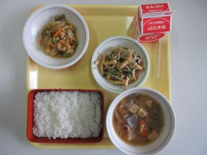 今日の給食のメニューは、ごはん・牛乳・鶏肉のしょうが炒め・油揚げとえのきのごまあえ・豚汁 です。